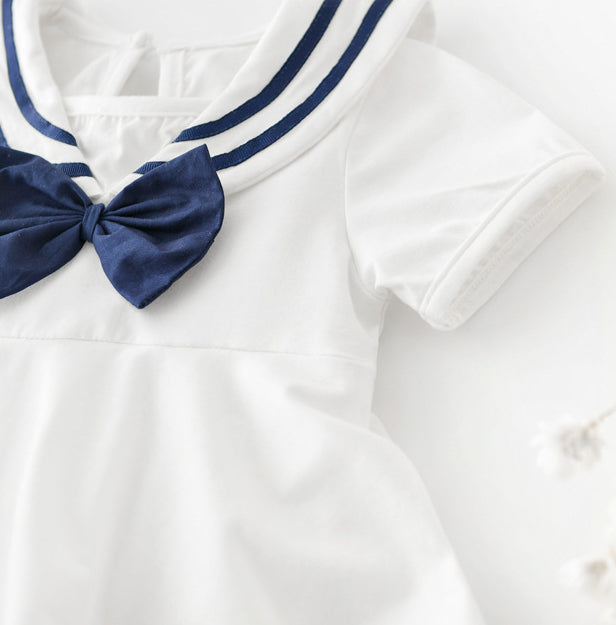 This classic nautical ⚓ style dress romper is made of 100% soft cotton with navy ribbon detail, collar and bow. Makes for the sweetest occasion wear but also comfortable enough for everyday.