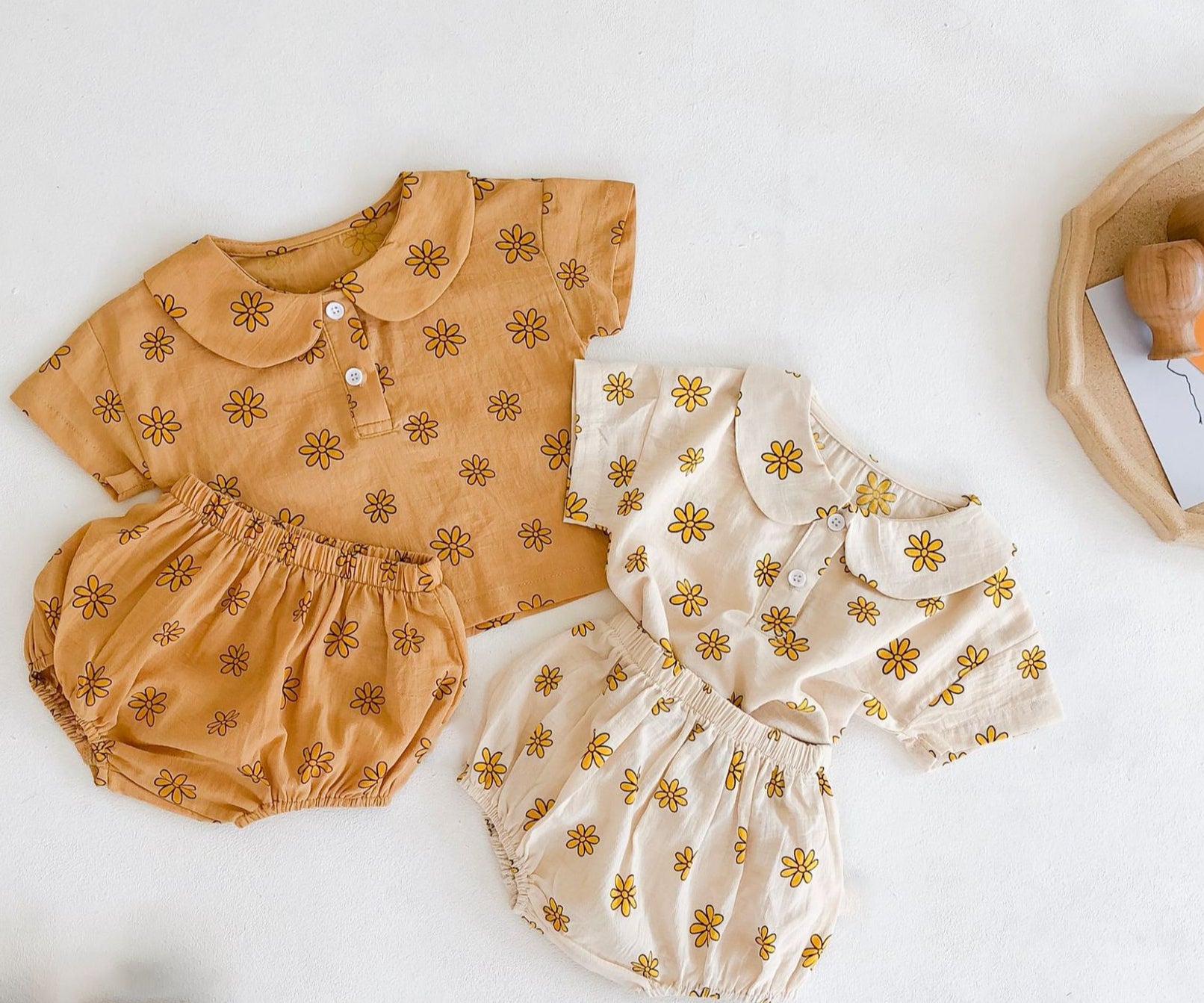 Soft cotton blouse with round collar and matching elasticated bloomer set with a fun floral print. Such a great outfit for summer. Comfortable and stylish.