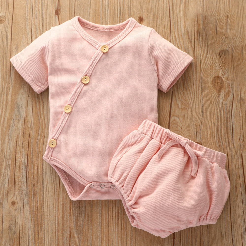 Such a great everyday basic set. Made of super soft cotton, this ribbed set features a short sleeved bodysuit with that buttons up down the front with a cross over kimono style in the front and has press studs at the bottom for very easy changes. It also includes a matching bloomer style shorts with a tie at the front.