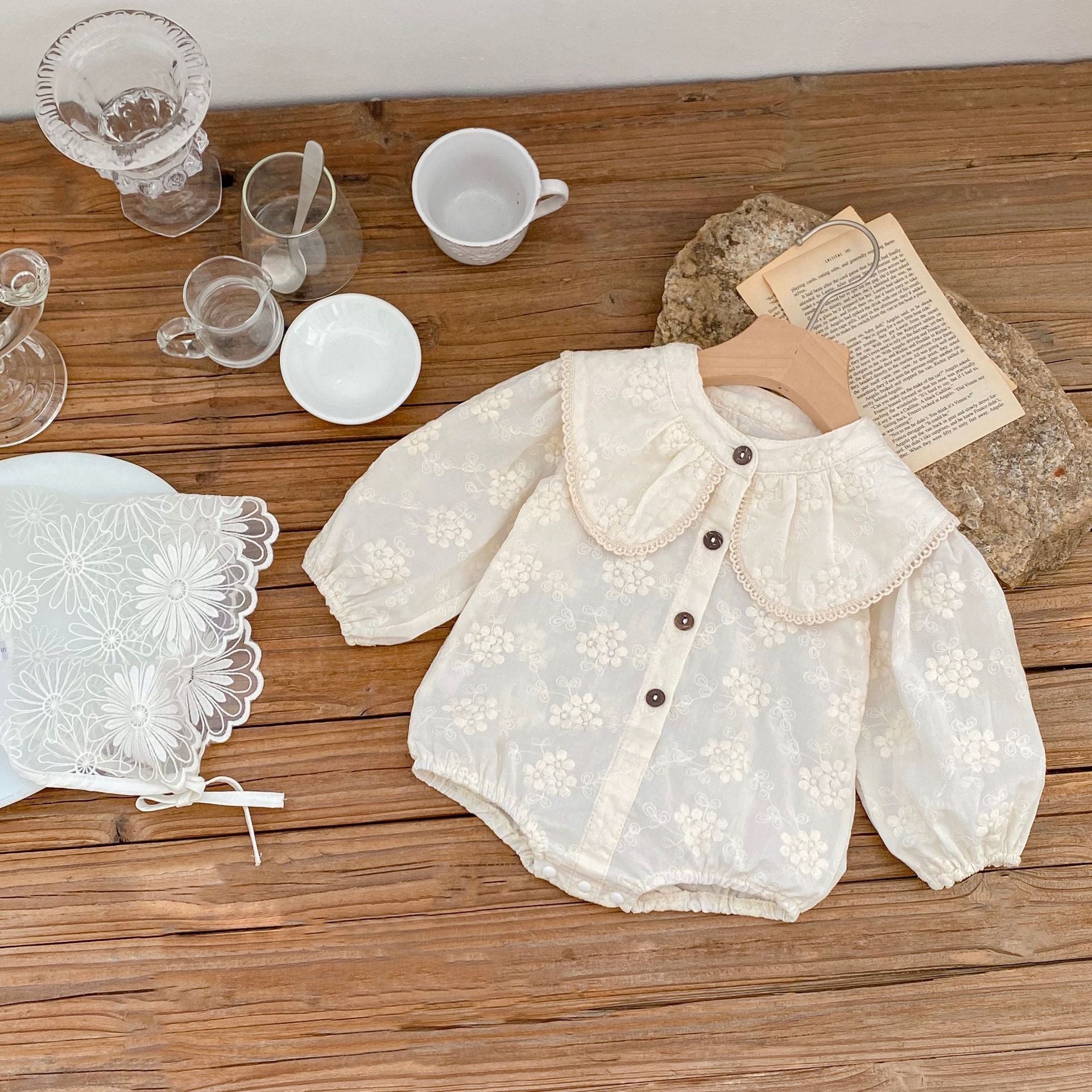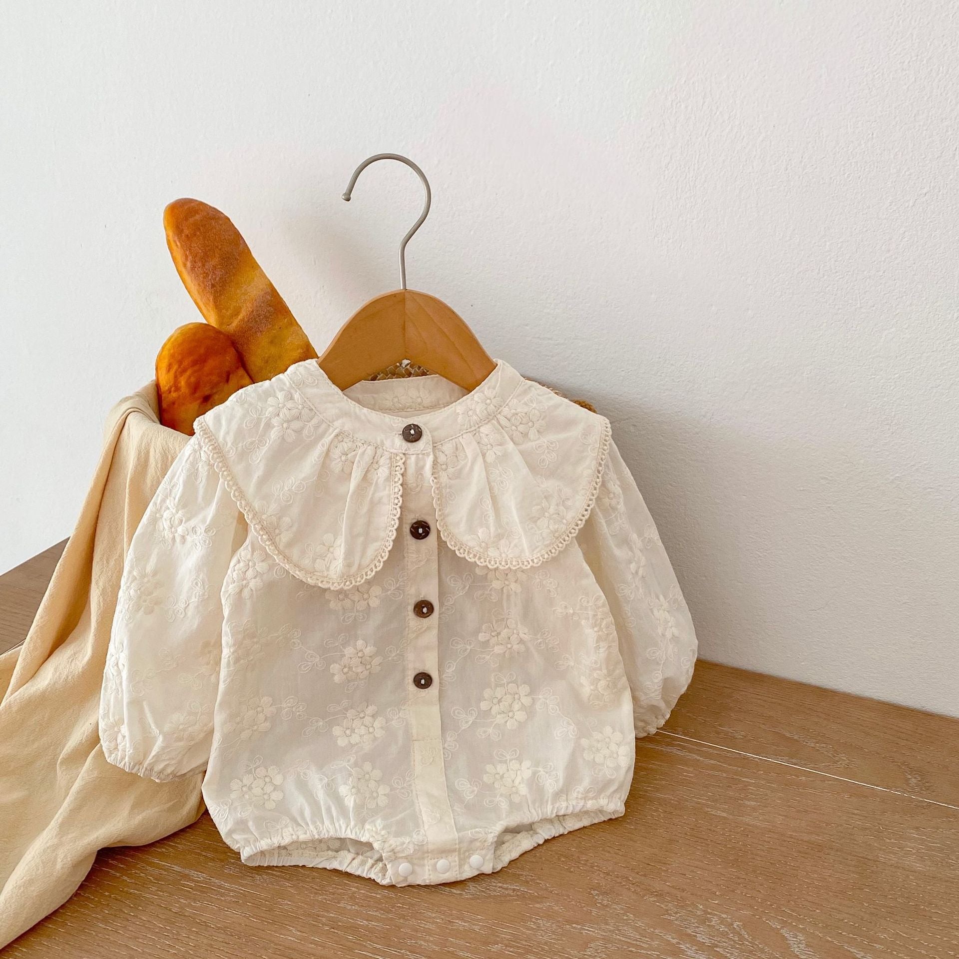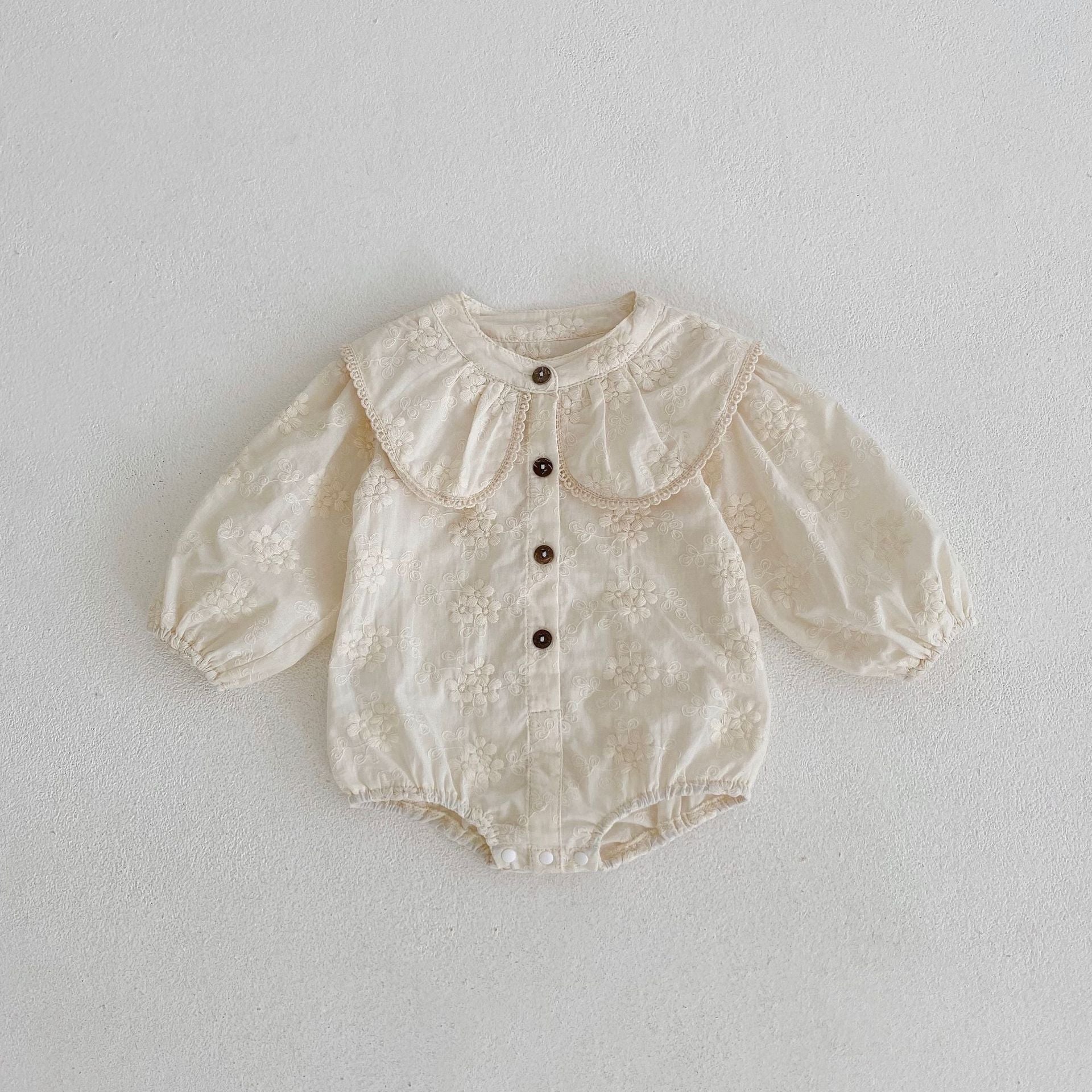 Our Emma lace collared romper is crafted from the softest cotton and features intricate embroidered detail for a luxurious look. The beautiful lace edged collar adds a touch of elegance, while the long sleeves keep you comfortable. Perfect for special occasions.