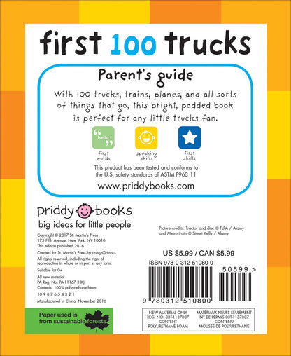 Your little one will love to discover the incredible trucks and things that go inside this bright board book. There are 100 different truck photographs to look at and talk about, and 100 truck names to read and learn, too. The pages are made from tough board for hours of fun reading, and the cover is softly padded for little hands to hold.
