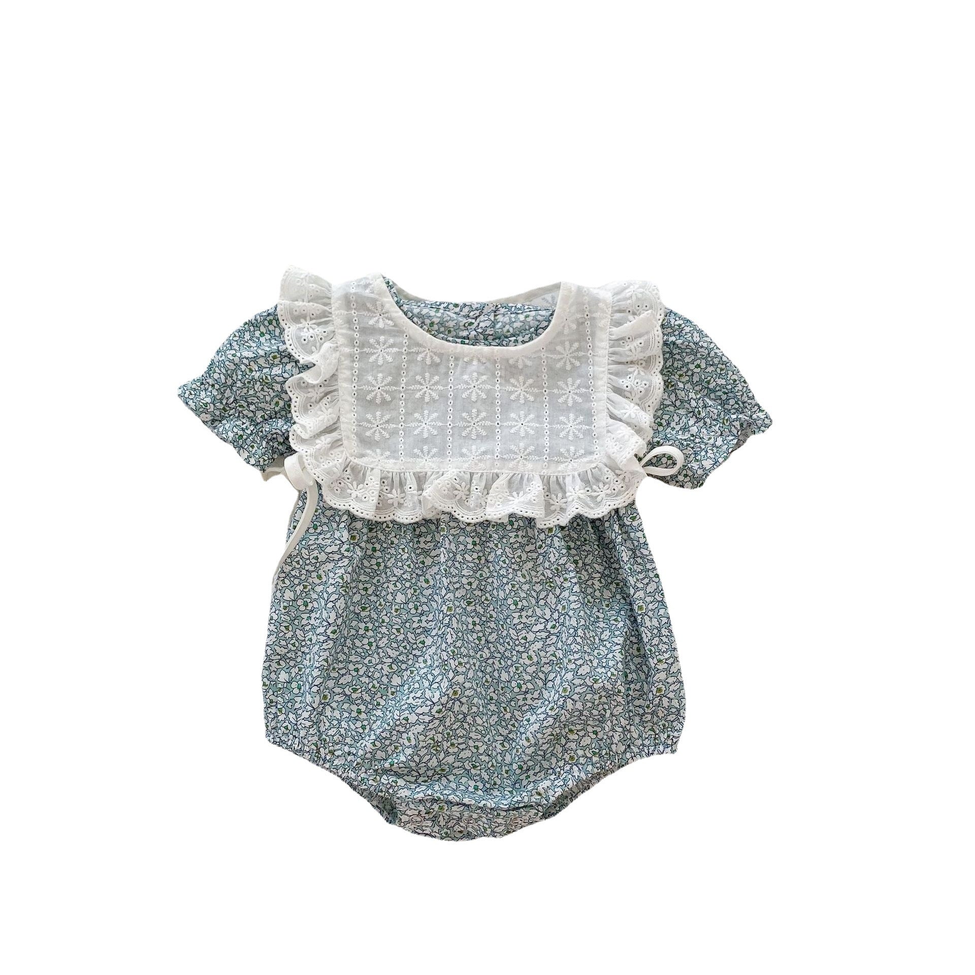 A cute floral print adorns this stunning summer romper. The romper is in a trendy sage colour with white flowers. This is perfect for little ones on the move. The white embroidered bib is easily tied in place on each side of your little one. Have a complete new look by quickly removing the bib.