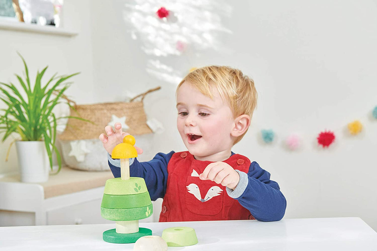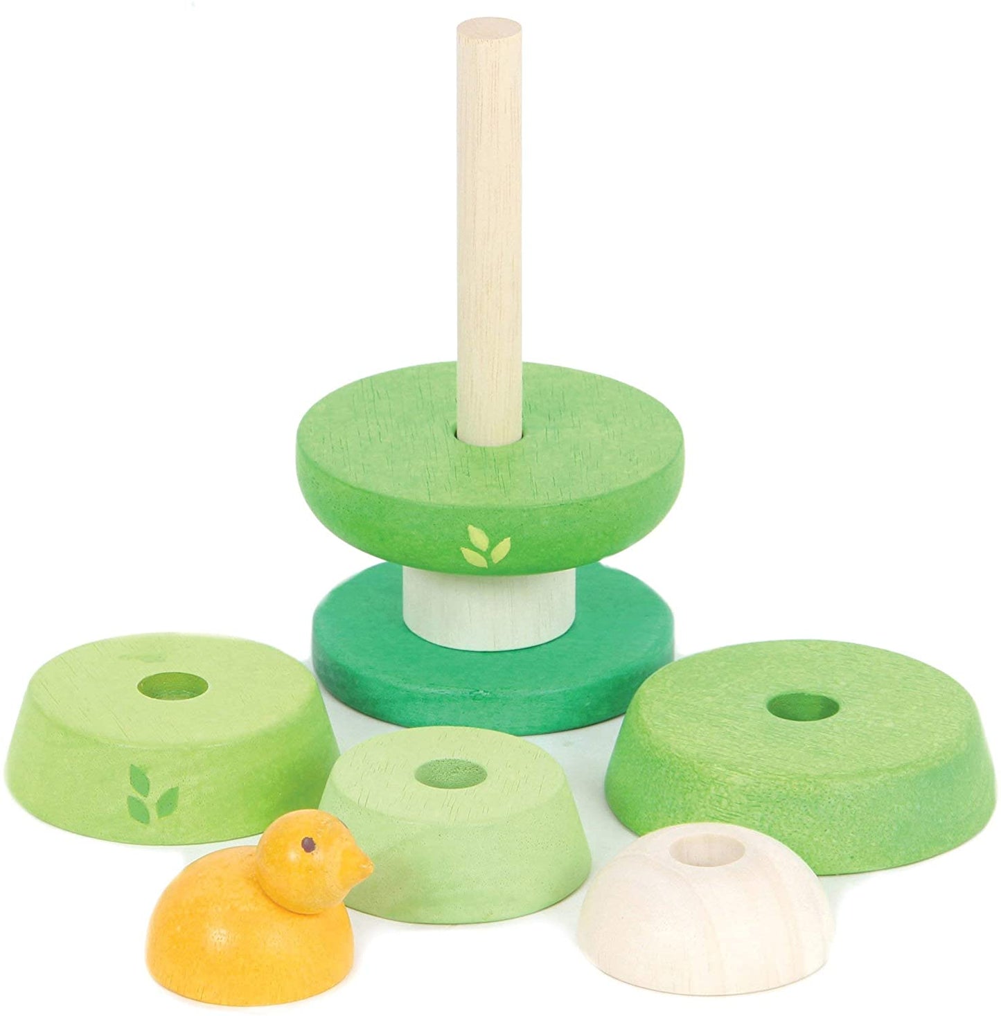 An ideal first stacking toy in subtle colours. Designed to look like a tree topped off with a bird in a nest.