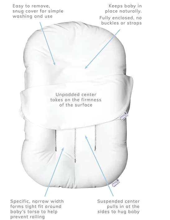 - SMARTLY DESIGNED TO HUG YOUR BABY. Patented design pulls in to hug your sweet babe. This hugging sensation calms baby and, with its tight fit, helps wedge them into place