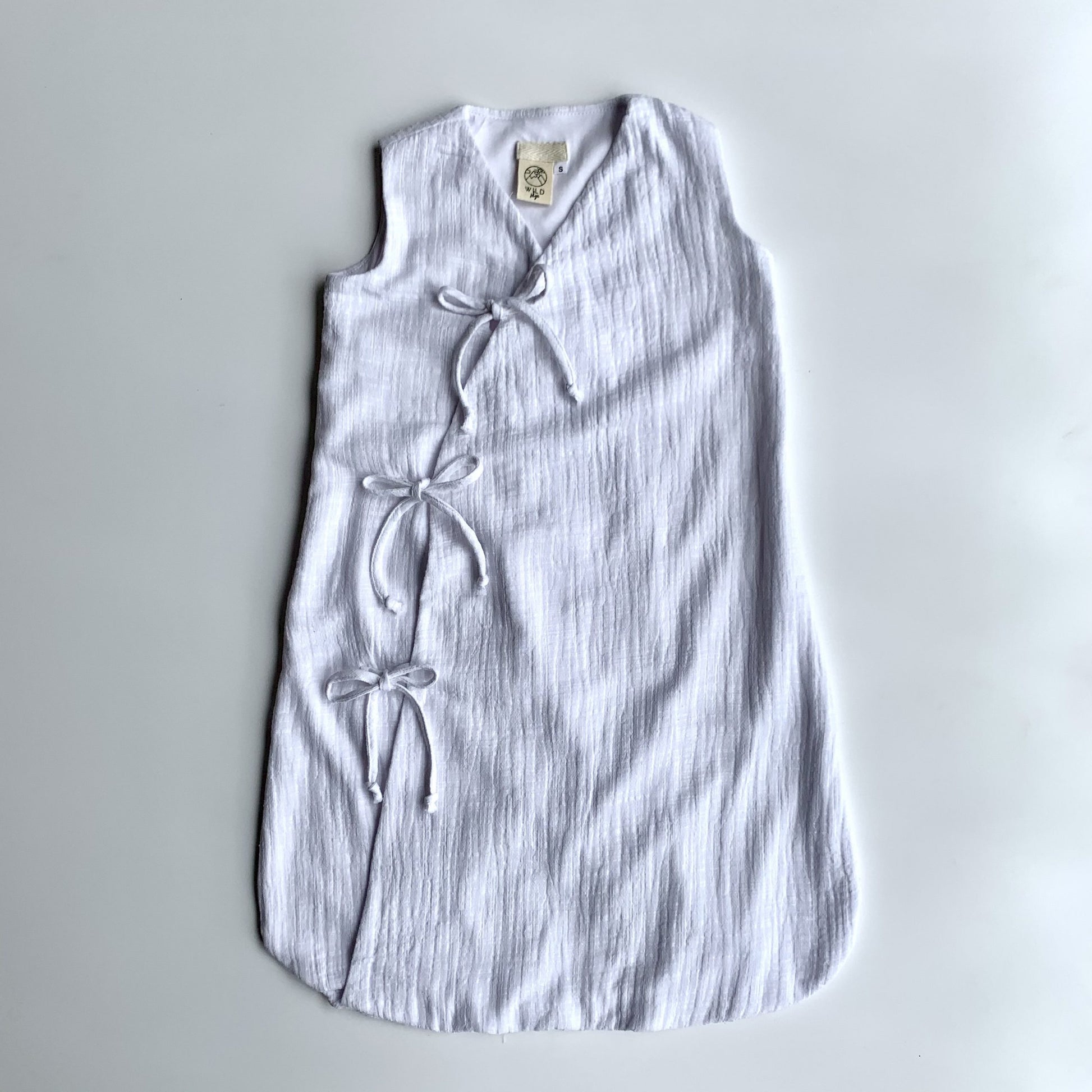 Sleeping bag also features ties in a kimono style for opening and closing for easy changes and comfort. Muslin is breathable and light and will ensure your baby is kept at the ideal temperature. Can be used with a long sleeved vest or sleepsuit for colder weather.