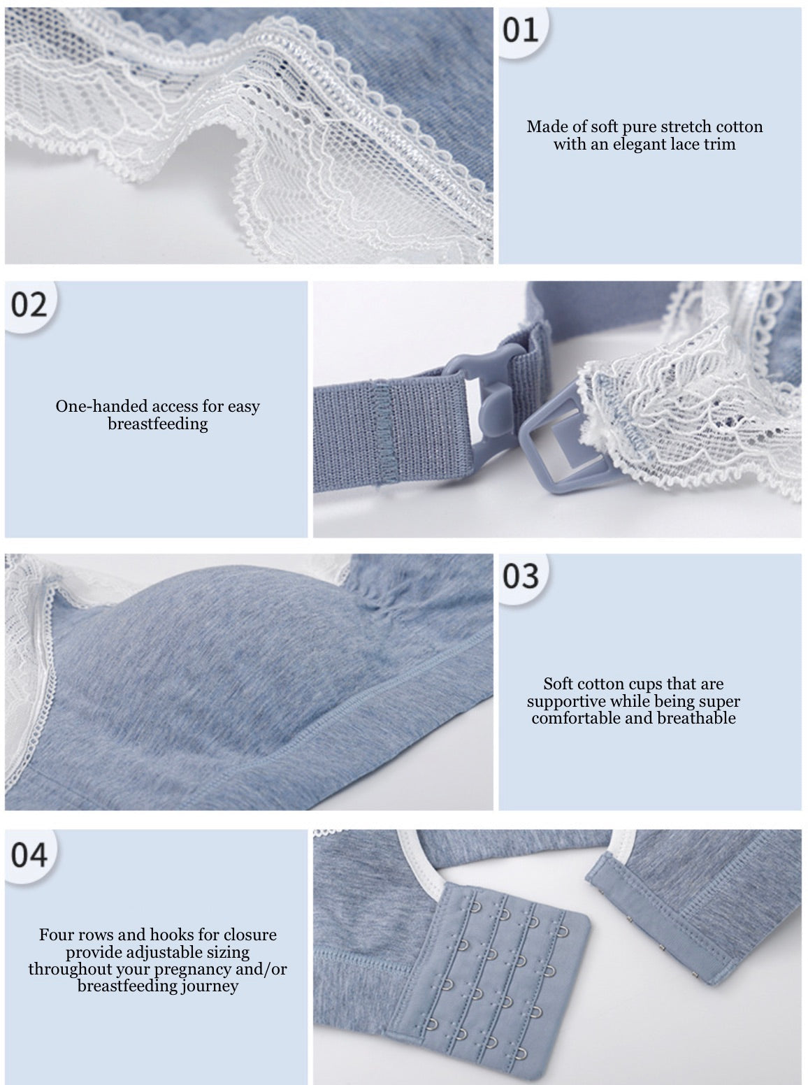 Our Willow Nursing Bra is made of soft pure stretch cotton with an elegant lace trimmed edge and has a clasp opening in the front providing one-handed access for easy breastfeeding. It has soft cotton cups that are supportive while being super comfortable and breathable. Four rows and hooks for closure provide adjustable sizing throughout your pregnancy and/or breastfeeding journey.